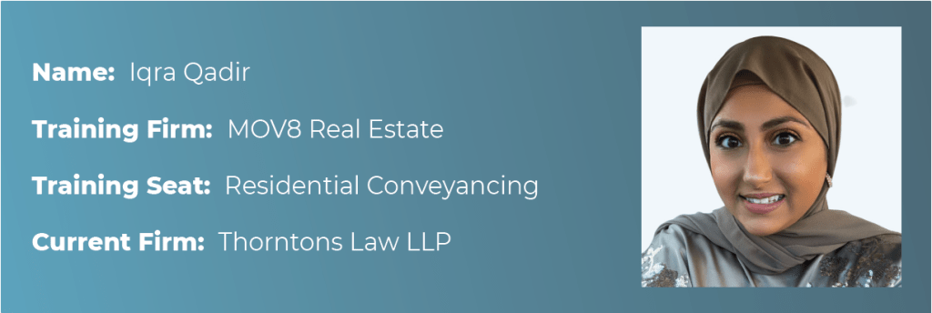 Iqra, a Newly Qualified Solicitor, completed her traineeship with MOV8 Real Estate, Estate Agents and Solicitors in October 2025. She was delighted to accept an NQ position at Thorntons Law LLP, where she specialises in Residential Conveyancing.